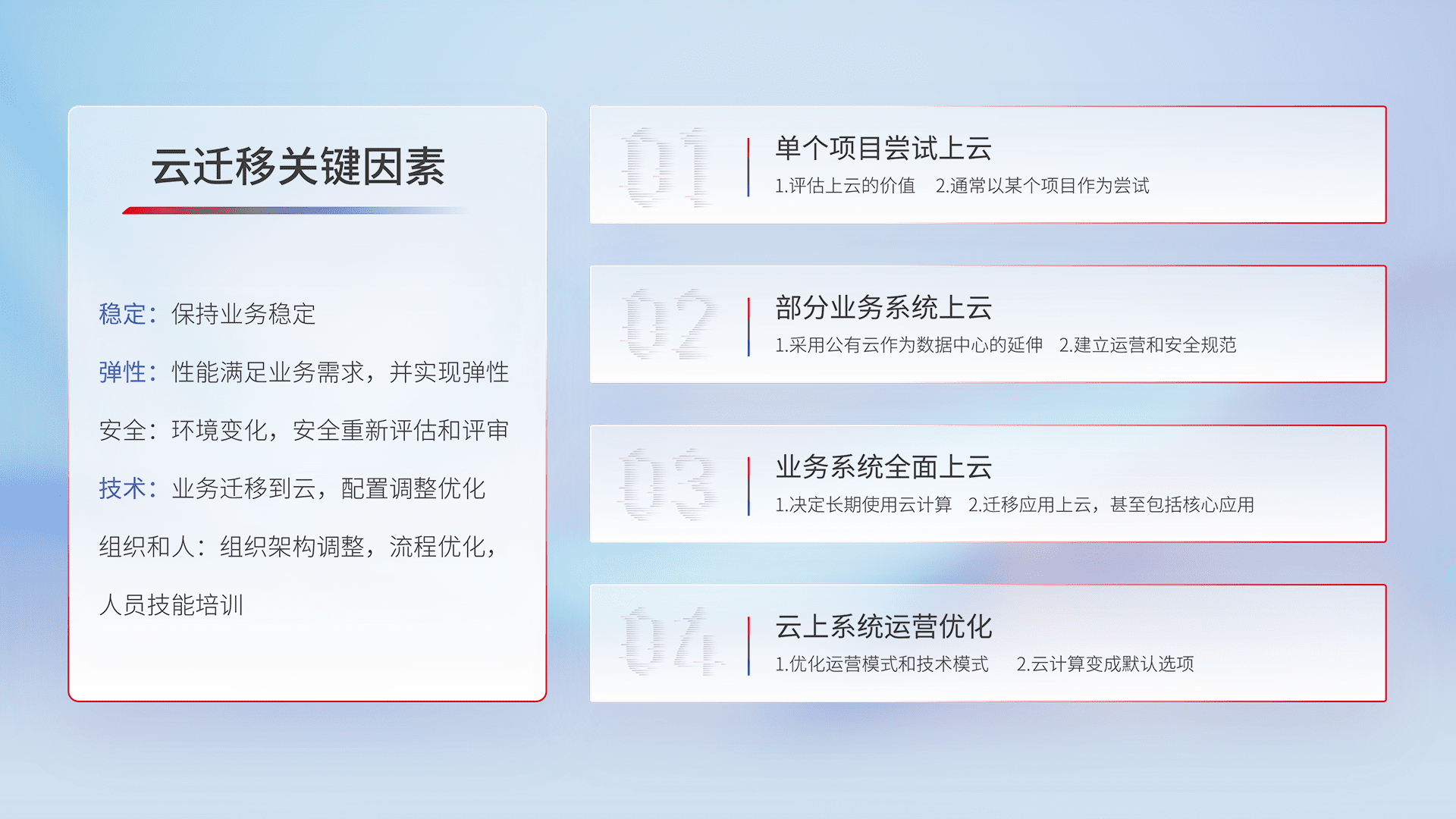 结合实际业务,,,从规划设计、、、云平台选型、、、、云原生改造、、、、数据迁移、、集成交付,,,迁移全过程为客户识别最佳上云路径,,,做好风险识别管理,,设计网络架构、、身份权限、、、安全审计合规、、、操作审计、、、日志审计、、监控告警策略、、多站点容灾设计等,,,对云上基础设施进行整体规划,,提升IT治理水平,,,,以满足弹性、、、、高可用、、高性能的需求。。。。