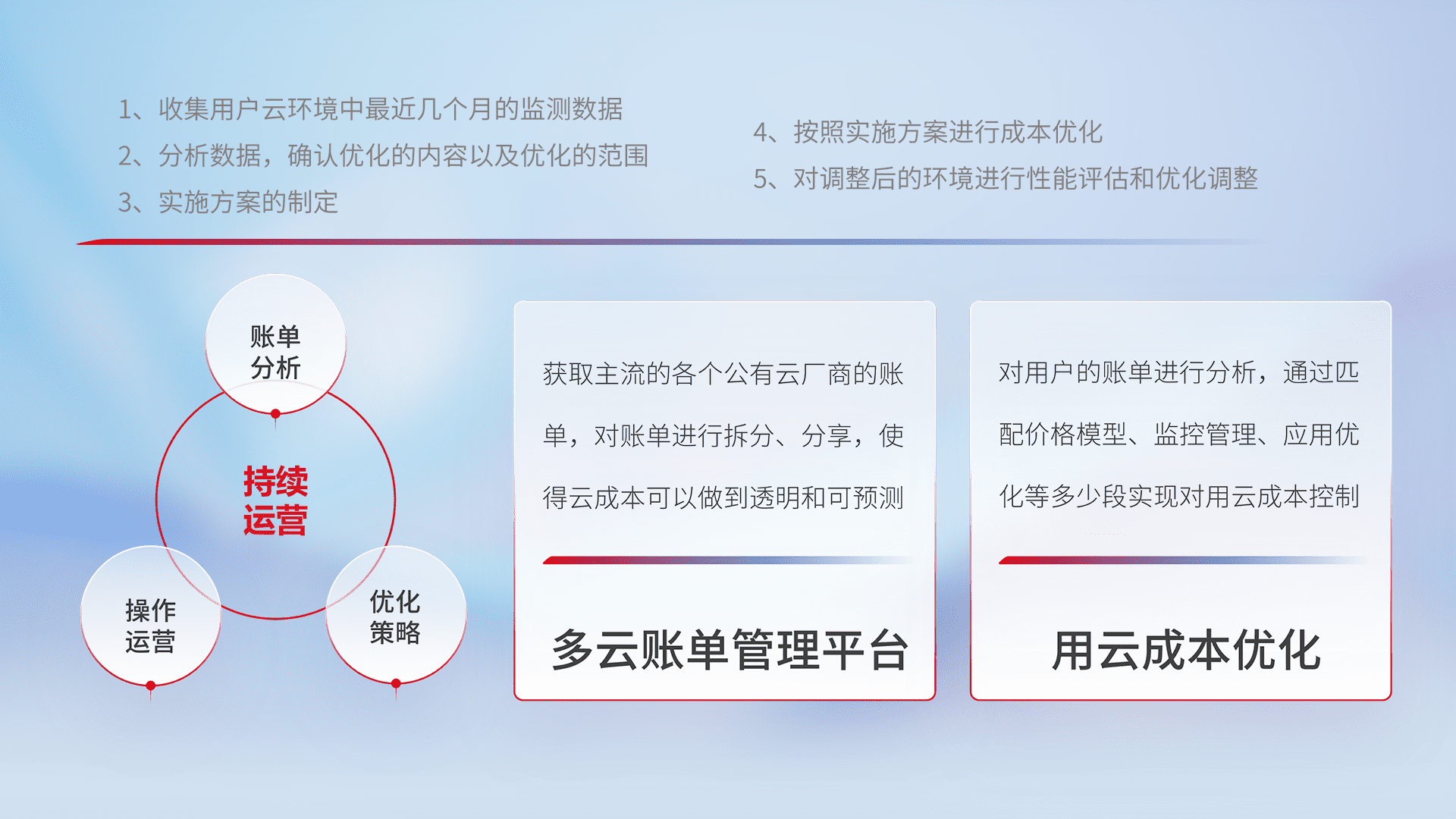 通过多云纳管,,,,以统一的资源数据模型把客户的云资源进行抽象和封装,,进而实现对多云资源的统一操作,,,保障云资源管理的可靠性、、、稳定性与可用性。。量身定制化运维内容,,,,配置、、开发运维、、、补丁管理、、、备份、、、监控、、、认证和访问管理、、、审计和日常巡检等,,,保障在用云过程中的可靠度,,稳定度以及高可用率。。。